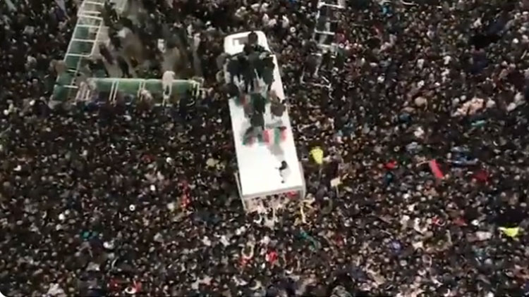 പുലർച്ച മുതൽ കറുത്ത വസ്ത്രം അണിഞ്ഞ് സ്ത്രീകളും പുരുഷന്മാരും തെഹ്റാനിലെ ഇൻക്വിലാബ് തെരുവിലൂടെ സർവകലാശാലയിലേക്ക് നീങ്ങിക്കൊണ്ടിരുന്നു. അൽപസമയം കഴിഞ്ഞപ്പോൾതന്നെ ഇൻക്വിലാബ് െതരുവ് കറുത്ത വസ്ത്രമണിഞ്ഞവരാൽ നിറഞ്ഞു. ഇറാെൻറ പതാകക്കൊപ്പം ചിലർ ഇറാഖിെൻറയും ലബനാനിെൻറയും പതാകകളും വീശിയിരുന്നു. വിലാപയാത്രയിലുടനീളം ‘ഡെത്ത് ടു അമേരിക്ക’ (അമേരിക്കക്ക് മരണം) മുദ്രാവാക്യങ്ങളുമായാണ് ജനങ്ങൾ അനുഗമിച്ചത്. സുലൈമാനിയുടെ മൃതദേഹം ചൊവ്വാഴ്ച ജന്മദേശമായ കിർമാനിൽ ഖബറടക്കും.