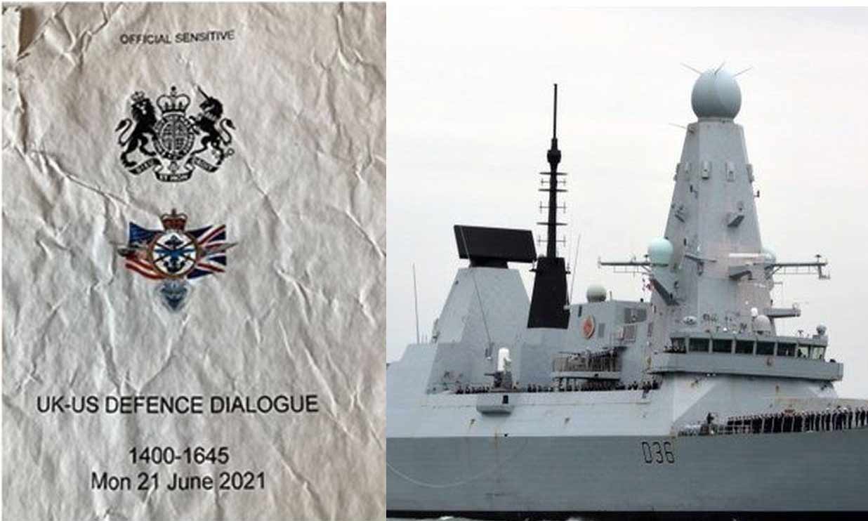നിലവിൽ ക്രിമിയൻ ജലാതിർത്തിയിലൂടെ നീങ്ങുന്ന എച്ച്.എം.എസ് ഡിഫെൻഡറിനെ ബുധനാഴ്ച 19 കിലോമീറ്റർ അകലെ തങ്ങളുടെ രണ്ട് തീരസേന കപ്പലുകൾ അനുഗമിച്ചിരുന്നതായി റഷ്യൻ പ്രതിരോധ മന്ത്രാലയം വെളിപ്പെടുത്തിയിരുന്നു. റഷ്യയുടെ അവകാശവാദം ബ്രിട്ടൻ നിഷേധിച്ചു. യുക്രെയ്നിൽനിന്ന് റഷ്യ കൈവശപ്പെടുത്തിയ ക്രീമിയൻ തീരത്തിലൂടെ അന്താരാഷ്ട്ര നിയമങ്ങൾ പാലിച്ച് ശാന്തമായാണ് യുദ്ധക്കപ്പലിൻെ റ സഞ്ചാരമെന്ന് രേഖയിൽ സൂചിപ്പിക്കുന്നുണ്ട്. െബ്രക്സിറ്റിന് ശേഷമുള്ള യൂറോപ്യൻ യൂനിയനുമായി ബന്ധപ്പെട്ട വിഷയങ്ങളും ബൈഡൻ സർക്കാറിൻെറ ഒരു മാസത്തെ പ്രവർത്തന അവലോകനവുമുൾപ്പെടെ കാര്യങ്ങളും രേഖകളിലുണ്ട്.
