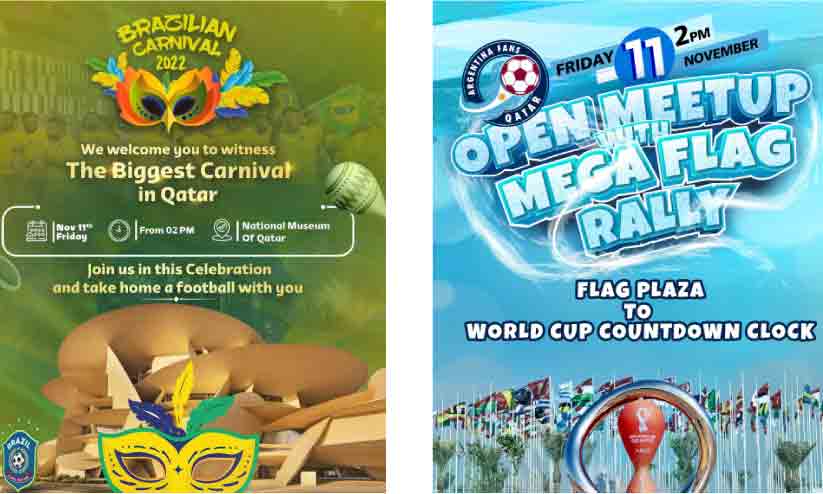 അർജന്റീനക്കും ബ്രസീലിനുംവേണ്ടി 2000 പേർ വീതം പങ്കെടുക്കും. ഇംഗ്ലണ്ടിനായി 600ഓളം പേർ. അർജന്റീന ഫാൻസ് ദോഹ കോർണിഷിൽ ഒന്നിക്കുമ്പോൾ ബ്രസീൽ ആരാധകർ ഖത്തർ നാഷനൽ മ്യൂസിയം പരിസരത്ത് സംഗമിച്ച് മഞ്ഞക്കടലായി ഒഴുകും. ഫ്ലാഗ് പ്ലാസയിൽ ഇംഗ്ലണ്ടിന്റെ സംഗമം ഫിഫ ഫാൻ ലീഡർ സ്റ്റീവ് മാക്കി ഫ്ലാഗ്ഓഫ് ചെയ്യും.