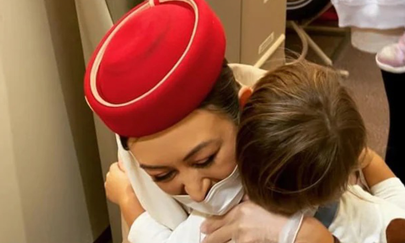 "ഞാൻ ഇതുവരെ കണ്ടിട്ടുള്ളതിൽ വച്ച് ഏറ്റവും വലിയ വി.ഐ.പി ബോർഡിംഗിൽ" -പോസ്റ്റിന്റെ അടിക്കുറിപ്പ് പറയുന്നു. എമിറേറ്റ്സിലെ എയർ ഹോസ്റ്റസ് ആണ് സ്വന്തം മകനെ വിമാനത്തിലേക്ക് സ്വീകരിക്കുന്നത്.