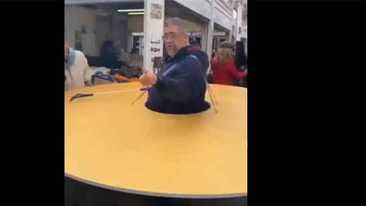 ഒരു മീറ്റർ ചുറ്റളവിലുള്ള ഡിസ്ക് ശരീരത്തിൽ ധരിച്ചാണ് സൂപ്പർ മാർക്കറ്റിലൂടെ ഇദ്ദേഹത്തിെൻറ നടത്തം. റോമിലെ സൂപ്പർ മാർക്കറ്റിൽ മഞ്ഞ ഡിസ്ക് ധരിച്ച് നിൽക്കുന്ന ഇയാളുടെ 12 സെക്കൻഡ് ദൃശ്യം നിമിഷങ്ങൾക്കുള്ളിൽ വൈറലായി.