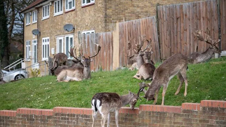 കൊറോണ വ ൈറസ് വ്യാപനത്തിനെതിരെ പൊരുതുന്ന യു.കെ രാജ്യമെമ്പാടും ലോക്ക്ഡൗൺ പ്രഖ്യാപിച്ചിരിക്കുകയാണ്. ആയിരങ്ങൾ ദിനേന വന്നുപോകുന്ന ലണ്ടൻ തെരുവും ഇപ്പോൾ മരുഭൂമി കണക്കെ നിശ്ചലമാണ്. ഇൗ തക്കം മുതലെടുത്ത് ഒരു കൂട്ടം മാനുകൾ തെരു വുകൾ കീഴടക്കി. കിഴക്കൻ ലണ്ടനിലെ കൂറ്റൻ കെട്ടിടങ്ങളും പുൽമൈതാനികളുമുള്ള തെരുവിലാണ് മാനുകൾ സ്വൈര്യ വിഹാരം ന ടത്തുന്നത്.