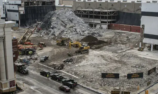 ഡൈനമിറ്റ് ബോംബുകൾ ഉപയോഗിച്ച് നടത്തിയ തുടർ സ്ഫോടനങ്ങളിൽ ആകാശം മുട്ടി നിന്ന കെട്ടിടം നിമിഷങ്ങൾക്കകം നിലംപതിച്ചു. 3,000 ഡൈനമിറ്റുകളാണ് ഉപയോഗപ്പെടുത്തിയത്. മാലിന്യം നിറഞ്ഞ പൊടിപടലങ്ങൾ ഏറെ നേരം പരിസരം പൊതിഞ്ഞുനിന്നിട്ടും കൈയടിച്ച് ആൾക്കൂട്ടം കാഴ്ചക്കാരായി നിന്നു. മനോഹര കടൽതീരവും നടപ്പാതകളുമുള്ള ന്യൂജഴ്സി ചൂതാട്ടത്തിനു കൂടി അറിയെപ്പട്ട അമേരിക്കൻ പട്ടണമാണ്. ഇവിടങ്ങളിൽ നിരവധി കെട്ടിടങ്ങൾ ട്രംപിെൻറ പേരിലുണ്ടായിരുന്നു. 2014 മുതൽ അടഞ്ഞുകിടക്കുകയാണ്.