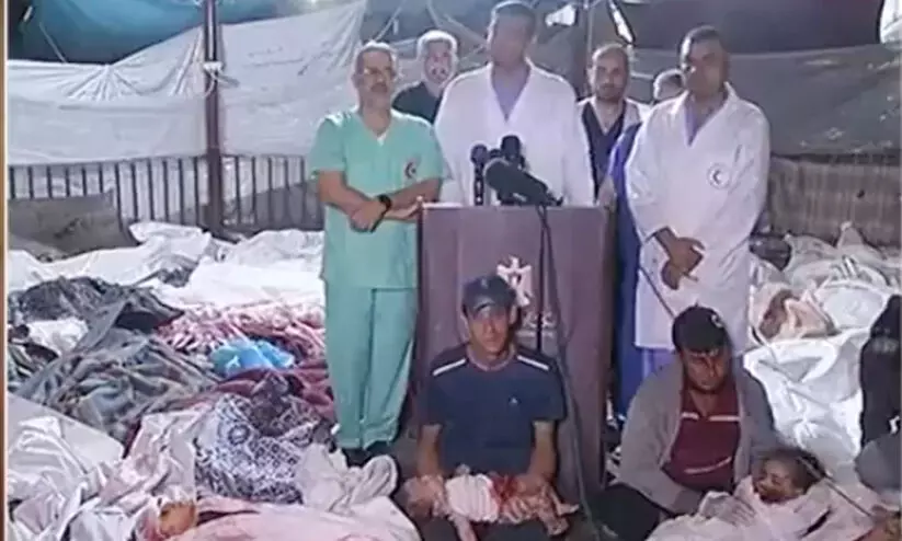ലോകമേ, കാണൂ...; കൂട്ടിയിട്ട മൃതദേഹങ്ങൾക്ക് നടുവിൽ വാർത്താസമ്മേളനം നടത്തി ഗസ്സ ആശുപത്രിയിലെ ഡോക്ടർമാർ