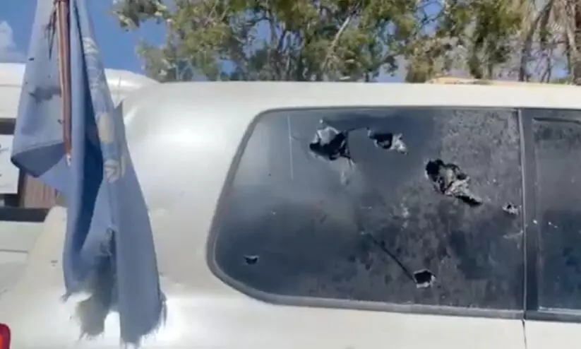 text_fieldsറഫയിൽ ഇസ്രായേൽ സൈന്യത്തിന്റെ ആക്രമണത്തിൽ തകർന്ന യു.എൻ വാഹനം (Screengrab / Al Jazeera)