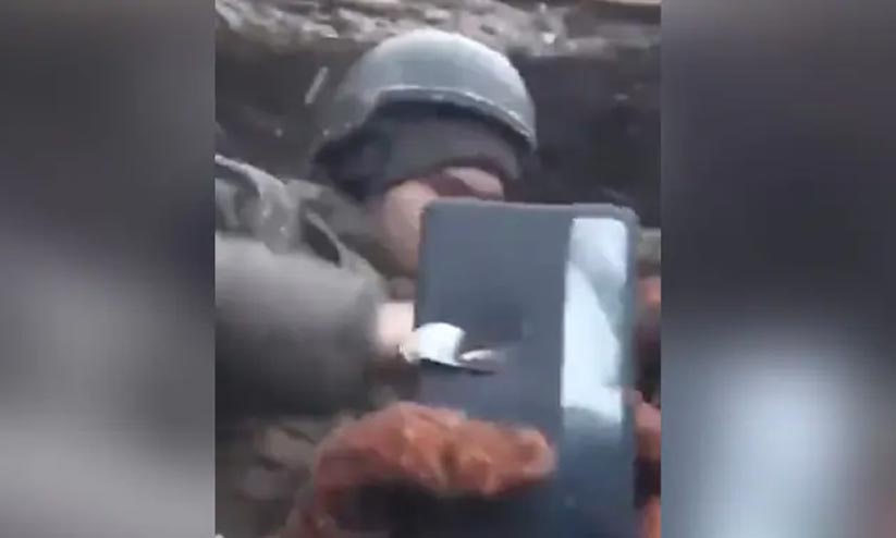 പോക്കറ്റിൽ നിന്നും വെടിയുണ്ട തറച്ച മൊബൈൽ ഫോൺ പുറത്തേക്കെടുത്ത് ഈ ഫോണാണ് തന്റെ ജീവൻ രക്ഷിക്കാൻ കാരണമെന്ന് സൈനികൻ സഹപോരാളിയോട് പറയുന്നത് ദൃശ്യങ്ങളാണ് സമൂഹമാധ്യമങ്ങളിൽ വൈറലായത്.