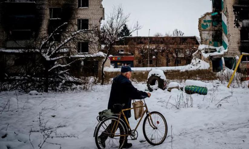 text_fieldsമഞ്ഞുവീണ യുക്രെയ്ൻ നഗരത്തിലൂടെ ൈസക്കിളും തള്ളി നീങ്ങുന്നയാൾ