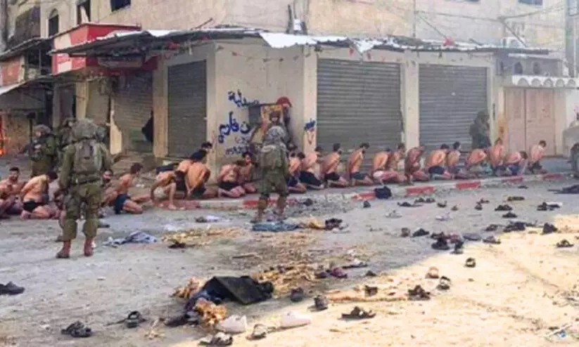 text_fieldsഗസ്സ: ക്രൂരമായ നരനായാട്ടിന്റെയും യുദ്ധക്കുറ്റങ്ങളുടെയും പേരിൽ അന്താരാഷ്ട്ര സമൂഹത്തിനു മുന്നിൽ നാണംകെടുന്നതിനിടെ തങ്ങളുടെ ചെയ്തികളെ ന്യായീകരിച്ച് ഇസ്രായേൽ. വടക്കൻ ഗസ്സയിൽനിന്ന് പിടികൂടിയ നൂറോളം വരുന്ന ഫലസ്തീനികളെ അടിവസ്ത്രം മാത്രം ധരിപ്പിച്ച് കണ്ണുകൾ മൂടിക്കെട്ടി തെരുവിൽ മുട്ടുകുത്തി ഇരുത്തിയ ദൃശ്യങ്ങൾ സമൂഹ മാധ്യമങ്ങളിൽ കഴിഞ്ഞദിവസം പ്രചരിച്ചിരുന്നു.