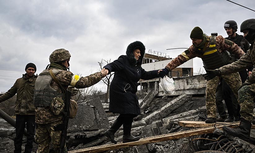 text_fieldsകിയവിന്റെ വടക്ക്പടിഞ്ഞാറൻ നഗരമായ ഇർപിനിൽ റഷ്യൻ സൈന്യത്തിന്റെ ആക്രമണത്തിൽ പാലം തകർന്നതിനെ തുടർന്ന് അവശിഷ്ടങ്ങൾക്കിടയിലൂടെ സ്ത്രീ രക്ഷപ്പെടാൻ സഹായിക്കുന്ന യുക്രെയ്ൻ സൈനികർ