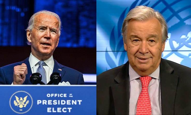പ്രസിഡൻറ് തെരഞ്ഞെടുപ്പിൽ വിജയിച്ച ബൈഡനെ ഗുെട്ടറസ് അഭിനന്ദിച്ചു. കോവിഡിനെതിരായ പോരാട്ടം ശക്തിപ്പെടുത്തുക, ആരോഗ്യരംഗത്തെ പുതിയ വെല്ലുവിളികളെ നേരിടുക, ജനാധിപത്യവും മനുഷ്യാവകാശവും ഉയർത്തിപ്പിടിക്കുക, ലോക സമാധാനം ഉറപ്പുവരുത്തുക തുടങ്ങിയവയിൽ അമേരിക്കയും െഎക്യരാഷ്ട്ര സഭയും ഒന്നിച്ചു പ്രവർത്തിക്കേണ്ടതിെൻറ ആവശ്യകത ചർച്ചയിൽ പ്രധാന വിഷയമായിരുന്നുവെന്ന് ബൈഡൻ- കമല ഹാരിസ് സഖ്യത്തിെൻറ വക്താവ് അറിയിച്ചു.