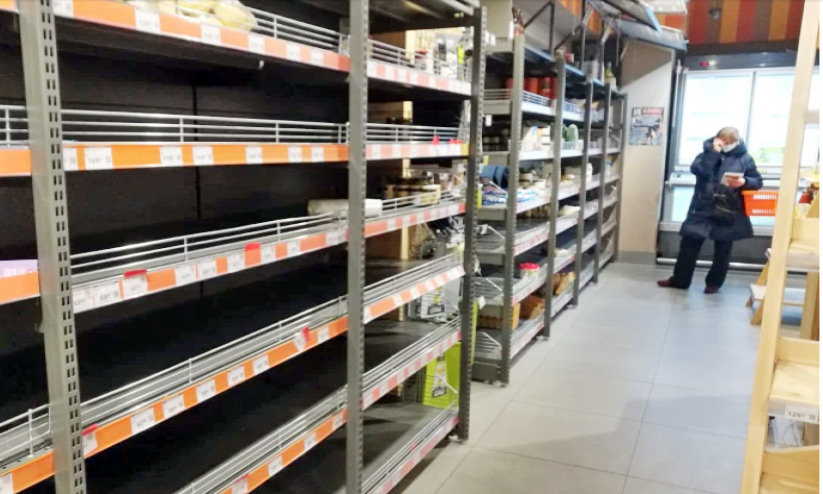 കിയവ് അടക്കമുള്ള പ്രധാന നഗരങ്ങളിലെല്ലാം തന്നെ ആളുകളെ കാണാനാകുക പലചരക്ക് കടകൾക്കും മെഡിക്കൽ ഷോപ്പുകൾക്കും മുന്നിലാണ്. പെച്ചർസ്കി ജില്ലയിലെ സൂപ്പർമാർക്കറ്റ് ശൃംഖലയായ സിൽപോയുടെ അലമാരകളെല്ലാം ശൂന്യമാണ്. വിലകുറഞ്ഞ ഭക്ഷണങ്ങളെല്ലാം തന്നെ കഴിഞ്ഞിരിക്കുന്നു. റൊട്ടിയോ പച്ചക്കറികളോ ഏതെങ്കിലും തരത്തിലുള്ള എണ്ണകളോ, മാംസമോ സോസേജുകളോ ഇല്ല. യുദ്ധത്തിന് തൊട്ടുമുമ്പ് തായ്ലൻഡിൽനിന്ന് എത്തിച്ച സ്പാനിഷ് ഹാം, ഫ്രഞ്ച് ചീസ്, സ്വിസ് ചോക്ലറ്റ്, മാമ്പഴം എന്നിങ്ങനെ വിലകൂടിയവ മാത്രമാണ് അവശേഷിക്കുന്നത്. നാളെ സാധനങ്ങൾ എത്തുമെന്നാണ് പ്രതീക്ഷിക്കുന്നതെന്നും എന്നാൽ, അതത്ര എളുപ്പമല്ലെന്നും കടയിലെ ജീവനക്കാരനായ കോൺസ്റ്റാന്റിൻ പറഞ്ഞു. സിൽപോയിൽ നിന്ന് വളരെ അകലെയല്ലാത്ത മെഡിക്കൽ ഷോപ്പിന് മുന്നിലും ആളുകൾ ക്ഷമയോടെ കാത്തുനിൽക്കുന്നു.