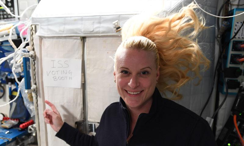 യു.എസിെൻറ ബഹിരാകാശ സഞ്ചാരികൾ ടെക്സാസിലെ ഹൂസ്റ്റണിലാണ് താമസിക്കുന്നത്. ഇവർക്ക് ബഹിരാകാശത്തുനിന്ന് ഇലക്ട്രോണിക് ബാലറ്റ് വഴി വോട്ട് രേഖപ്പെടുത്താൻ ടെക്സാസിലെ നിയമം അനുശാസിക്കുന്നുണ്ട്. മിഷൻ കൺട്രോൾ ഇലക്ട്രോണിക് ബാലറ്റ് ബഹിരാകാശത്തേക്ക് അയക്കുകയും അവിടെനിന്ന് വോട്ട് രേഖപ്പെടുത്തി തിരിച്ചയക്കുകയുമാണ് ചെയ്യുക.