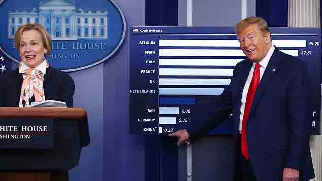 യു.എ സ് കൊറോണ സെൽ ചുമതലയുള്ള ഡോ. ഡെബോറ ബിർക്സ് കോവിഡ് മരണ സ്ഥിതി വിവരക്കണക്കുകൾ അവതരിപ്പിക്കുന്നതിനിടെ പ്ര സിഡൻറ് ഇടപെടുകയായിരുന്നു. ചൈനയുടെ ഔദ്യോഗിക കണക്കുകൾ അസാധ്യമാണെന്നായിരുന്നു ട്രംപിെൻറ അഭിപ്രായം. ഡോ. ഡെബ ോറ അവതരിപ്പിച്ച ചാർട്ടിെൻറ ചുവടെ ഒരു ലക്ഷം പേർക്ക് 0.33 എന്ന ചൈനയുടെ മരണനിരക്ക് ചൂണ്ടിക്കാണിച്ച ട്രംപ്, 'ആരെങ്കിലും ഈ നമ്പർ വിശ്വസിക്കുന്നുണ്ടോ?' എന്നും ചോദിച്ചു. ഇതിെൻറ വിശ്വാസ്യതയില്ലായ്മ സൂചിപ്പിക്കാൻ ഒരു നക്ഷത്രചിഹ്നം അടയാളപ്പെടുത്തിയിരുന്നു. യു.എസിൽ 1,00,000 ആളുകൾക്ക് 11.24 എന്നതാണ് മരണനിരക്ക്. 45.2 നിരക്കുള്ള ബെൽജിയമാണ് മുന്നിൽ.